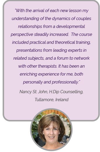 Since starting this course the one thing that has resonated in my clinical work is feeling that I have structure, and this I believe relates to the couple clarifying their goals for working with me. I'm excited to help couples put into words their desire for a better life together and for ongoing growth. Thank you.”