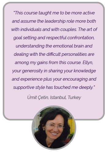 Since 2006, Ellyn has led innovative couples therapy training programs online. Professionals from around the world connect with her through internet, conference calls and blog discussions to study couples therapy.